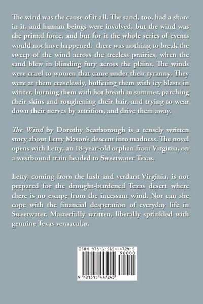 The wind was the cause of it all. The sand, too, had a share in it, and human beings were involved, but the wind was the primal force, and but for it the whole series of events would not have happened. there was nothing to break the sweep of the wind across the treeless prairies, when the sand blew in blinding fury across the plains. The winds were cruel to women that came under their tyranny. They were at them ceaselessly, buffeting them with icy blasts in winter, burning them with hot breath in summer, parching their skins and roughening their hair, and trying to wear down their nerves by attrition, and drive them away. The Wind by Dorothy Scarborough is a tensely written story about Letty Mason's descent into madness. The novel opens with Letty, an 18-year-old orphan from Virginia, on a westbound train headed to Sweetwater Texas. Letty, coming from the lush and verdant Virginia, is not prepared for the drought-burdened Texas desert where there is no escape from the incessant wind. Nor can she cope with the financial desperation of everyday life in Sweetwater. Masterfully written, liberally sprinkled with genuine Texas vernacular.