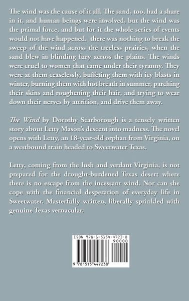 The wind was the cause of it all. The sand, too, had a share in it, and human beings were involved, but the wind was the primal force, and but for it the whole series of events would not have happened. there was nothing to break the sweep of the wind across the treeless prairies, when the sand blew in blinding fury across the plains. The winds were cruel to women that came under their tyranny. They were at them ceaselessly, buffeting them with icy blasts in winter, burning them with hot breath in summer, parching their skins and roughening their hair, and trying to wear down their nerves by attrition, and drive them away. The Wind by Dorothy Scarborough is a tensely written story about Letty Mason's descent into madness. The novel opens with Letty, an 18-year-old orphan from Virginia, on a westbound train headed to Sweetwater Texas. Letty, coming from the lush and verdant Virginia, is not prepared for the drought-burdened Texas desert where there is no escape from the incessant wind. Nor can she cope with the financial desperation of everyday life in Sweetwater. Masterfully written, liberally sprinkled with genuine Texas vernacular.