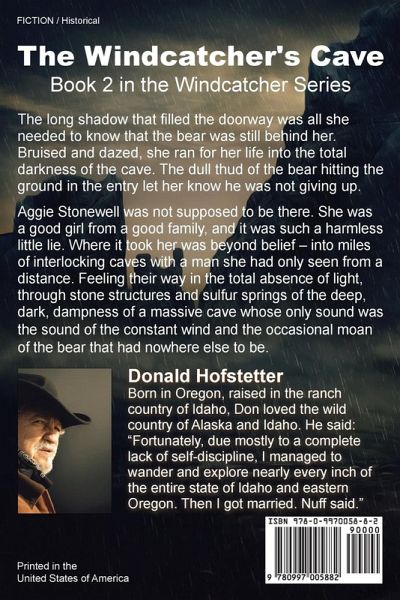 The long shadow that filled the doorway was all she needed to know that the bear was still behind her. Bruised and dazed, she ran for her life into the total darkness of the cave. The dull thud of the bear hitting the ground in the entry let her know he was not giving up. Aggie Stonewell was not supposed to be there. She was a good girl from a good family, and it was such a harmless little lie. Where it took her was beyond belief - into miles of interlocking caves with a man she had only seen from a distance. Feeling their way in the total absence of light, through stone structures and sulfur springs of the deep, dark, dampness of a massive cave whose only sound was the sound of the constant wind and the occasional moan of the bear that had nowhere else to be. In the other world, the one outside, the ground echoed with the sound of horses' hooves, scouring every inch of forest for miles, desperate to find a young woman lost someplace in the Sawtooth, a land that rarely gives up its dead. Set at the turn of the century, in a small town in the depths of the Sawtooth Mountains, a young woman is lost in a cave with a young Sioux Indian brave she hardly knows. If the cave doesn't kill them, the bear that chased her in there is bound to. The only light they have is a small flashlight with a weak battery that they dare not use. The cave appears to be endless and is filled with strange surprises. Interlocking tunnels, where anything could be expected, leave them wandering in the total absence of light, feeling their way along, searching for a way out while they try to stay just one step ahead of the bear. The bear that Talon knows he will be forced to meet face to face if he can't find a way out. In the outside world, her father and friends search every crevice in the mountains for even the tiniest clue that might lead them to the lost girl. If you want to leave behind the chaos of this modern world for a little while, Don's Windcatcher series is for you. While these books take you back to a less stressful time in the American West, they have plenty of action, intrigue, and even a bit of romance. This book has been formatted to current large print standards, with a minimum 18 point text size.