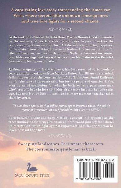 A captivating love story transcending the American West, where secrets hide unknown consequences and true love fights for a second chance. At the end of the War of the Rebellion, Mariah Renwick is still haunted by the memory of her late sister as she tries to piece together the remnants of an innocent time lost. All she wants is to bring happiness home again. Then dashing Lieutenant Nathan Lawton rushes into her life and becomes her new husband. But Nathan's dark and tormented past hides revenge and betrayal as he stakes his claim to the Renwick fortune and his future out West. Railroad magnate, Julian Marquette, has just returned to St. Louis to secure another bank loan from Mariah's father. A brilliant mastermind, Julian orchestrates the construction of the Transcontinental Railroad, not for the sake of his own vanity but for the people of America. He's a man borne of conviction for what he believes in, a passionate man who's secretly been in love with Mariah since he first saw her two years ago. But now it's too late . . . until an intimate moment together takes them by storm. "It was there again, in that infinitesimal space between them, the subtle tremor of attraction, at once forbidden but about to collide." Torn between desire and duty, Mariah is caught in a crossfire as she faces unimaginable struggles on an epic westward journey that shows no mercy. Can Julian fight against impossible odds for the woman he loves, or is all hope lost? Sweeping landscapes. Passionate characters. The consummate gentleman is back.
