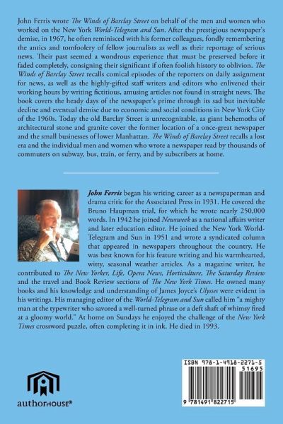 John Ferris wrote The Winds of Barclay Street on behalf of the men and women who worked on the New York World-Telegram and Sun. After the prestigious newspaper's demise, in 1967, he often reminisced with his former colleagues, fondly remembering the antics and tomfoolery of fellow journalists as well as their reportage of serious news. Their past seemed a wondrous experience that must be preserved before it faded completely, consigning their signi¿cant if often foolish history to oblivion. The Winds of Barclay Street recalls comical episodes of the reporters on daily assignment for news, as well as the highly-gifted stä writers and editors who enlivened their working hours by writing ¿ctitious, amusing articles not found in straight news. The book covers the heady days of the newspaper's prime through its sad but inevitable decline and eventual demise due to economic and social conditions in New York City of the 1960s. Today the old Barclay Street is unrecognizable, as giant behemoths of architectural stone and granite cover the former location of a once-great newspaper and the small businesses of lower Manhattan. The Winds of Barclay Street recalls a lost era and the individual men and women who wrote a newspaper read by thousands of commuters on subway, bus, train, or ferry, and by subscribers at home.