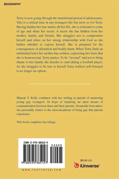 Terry is now going through the transitional period of adolescence. This is a critical time in any teenagers life but more so for Terry. Having hidden her true nature all her life, she is reluctant to come of age and share her secret. A secret she has hidden from her mother, family and friends. She struggles not to compromise herself and relies on her strong relationship with God as she battles whether to expose herself. She is prepared for the consequences of alienation and bodily harm. When Terry finds an unfinished letter her mother has written, expressing her fears that she is homosexual, Terry panics. To be 'normal 'and not to bring shame to her family she decides to start dating a football player. As she struggles to be true to herself Terry realizes self-betrayal is no longer an option.