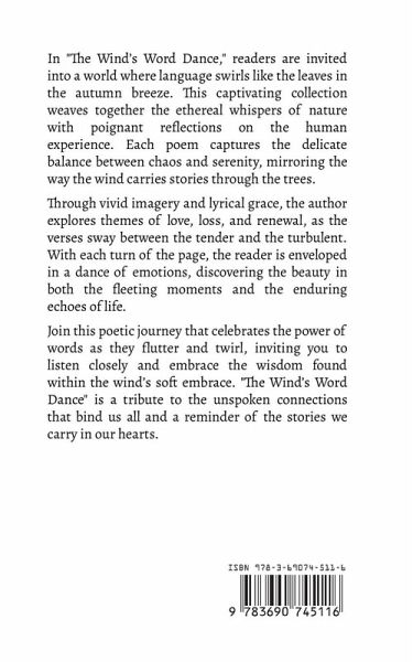 In "The Wind's Word Dance," readers are invited into a world where language swirls like the leaves in the autumn breeze. This captivating collection weaves together the ethereal whispers of nature with poignant reflections on the human experience. Each poem captures the delicate balance between chaos and serenity, mirroring the way the wind carries stories through the trees. Through vivid imagery and lyrical grace, the author explores themes of love, loss, and renewal, as the verses sway between the tender and the turbulent. With each turn of the page, the reader is enveloped in a dance of emotions, discovering the beauty in both the fleeting moments and the enduring echoes of life. Join this poetic journey that celebrates the power of words as they flutter and twirl, inviting you to listen closely and embrace the wisdom found within the wind's soft embrace. "The Wind's Word Dance" is a tribute to the unspoken connections that bind us all and a reminder of the stories we carry in our hearts.