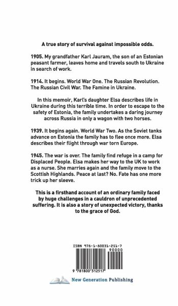 A true story of survival against impossible odds. 1905. My grandfather Karl Jauram, the son of an Estonian peasant farmer, leaves home and travels south to Ukraine in search of work. 1914. It begins. World War One. The Russian Revolution. The Russian Civil War. The Famine in Ukraine. In this memoir, Karl's daughter Elsa describes life in Ukraine during this terrible time. In order to escape to the safety of Estonia, the family undertakes a daring journey across Russia in only a wagon with two horses. 1939. It begins again. World War Two. As the Soviet tanks advance on Estonia the family has to flee once more. Elsa describes their flight through war torn Europe. 1945. The war is over. The family find refuge in a camp for Displaced People. Elsa makes her way to the UK to work as a nurse. She marries again and the family move to the Scottish Highlands. Peace at last? No. Fate has one more trick up her sleeve. This is a firsthand account of an ordinary family faced by huge challenges in a cauldron of unprecedented suffering. It is also a story of unexpected victory, thanks to the grace of God.
