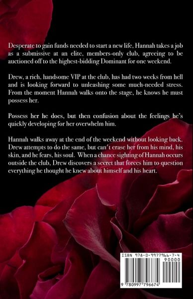 Desperate to gain funds needed to start a new life, Hannah takes a job as a submissive at an elite, members only club, agreeing to be auctioned off to the highest bidding Dominant for one weekend. Drew, a rich, handsome VIP at the club, has had two weeks from hell and is looking forward to unleashing some much-needed stress. From the moment Hannah walks onto the stage, he knows he must possess her. Possess her he does, but when he does, confusion about the feelings he's quickly developing for her, overwhelm him. Hannah walks away at the end of the weekend without looking back. Drew attempts to do the same, but can't erase her from his mind, his skin, and he fears, his soul. When a chance sighting of Hannah occurs outside the club, Drew discovers a secret that forces him to question everything he thought he knew about himself and his heart.