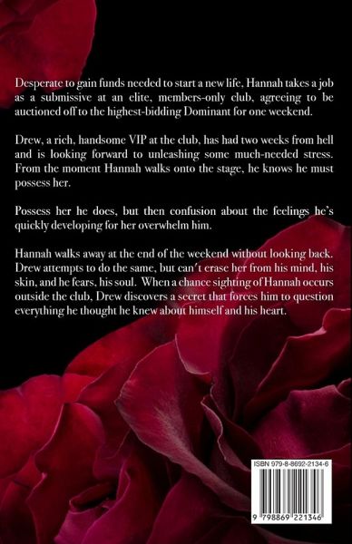 Desperate to gain funds needed to start a new life, Hannah takes a job as a submissive at an exclusive, members only club, agreeing to be auctioned off to the highest bidding Dominant for one weekend. Drew, a rich, handsome VIP at the club, has had two weeks from hell and is looking forward to unleashing some much-needed stress. From the moment Hannah walks onto the stage, he knows he must possess her. Possess her he does, but when he does, confusion about the feelings he's quickly developing for her, overwhelm him. Hannah walks away at the end of the weekend without looking back. Drew attempts to do the same, but can't erase her from his mind, his skin, and he fears, his soul. When a chance sighting of Hannah occurs outside the club, Drew discovers a secret that forces him to question everything he thought he knew about himself and his heart.