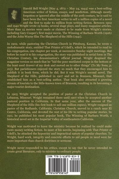 Harold Bell Wright (May 4, 1872 – May 24, 1944) was a best-selling American writer of fiction, essays, and nonfiction. Although mostly forgotten or ignored after the middle of the 20th century, he is said to have been the first American writer to sell a million copies of a novel and the first to make $1 million from writing fiction. Between 1902 and 1942 Wright wrote 19 books, several stage plays, and many magazine articles. More than 15 movies were made or claimed to be made from Wright's stories, including Gary Cooper's first major movie, The Winning of Barbara Worth (1926) and the John Wayne film The Shepherd of the Hills (1941). In 1902, while pastoring the Christian Church in Pittsburg, Kansas, he wrote a melodramatic story, entitled That Printer of Udell's, which he intended to read to his congregation, one chapter per week, at successive Sunday night meetings. But before he read it to his congregation, the story was published in serial form in The Christian Century, his denomination's official journal. Wright despised the magazine version so much that he "hid the poor mutilated corpse in the bottom of the least used drawer of my desk and moved on to other things" (To My Sons, p. 213). But parishioners enjoyed the story so much that they encouraged him to publish it in book form, which he did. But it was Wright's second novel, The Shepherd of the Hills, published in 1907 and set in Branson, Missouri, that established him as a best-selling author. That book also attracted a growing stream of tourists to the little-known town of Branson, resulting in its becoming a major tourist destination. In 1905 Wright accepted the position of pastor at the Christian Church in Lebanon, Missouri. Wright remained there until 1907 when he accepted another pastoral position in California. In that same year, after the success of The Shepherd of the Hills (his first book to sell one million copies), Wright resigned as pastor of the Redlands, California, Christian Church, moved to a ranch near El Centro, California, and devoted the rest of his life to writing popular stories. In 1911, he published his most popular book, The Winning of Barbara Worth, a historical novel set in the Imperial Valley of southeastern California. Wright was motivated to leave the ministry because he realized he could make more money writing fiction. In most of his novels, beginning with That Printer of Udell's, he attacked the hypocrisy and impractical nature of popular churches. To Wright, hard work, integrity and concrete efforts to aid people in need were far more important than church doctrines or sermons. Wright never responded to his critics, except to say that he never intended to create great literature, only to minister to ordinary people. (wikipedia.org)