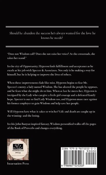 Should he abandon the success he's always wanted for the love he knows he needs? "Does not Wisdom call? Does she not raise her voice? At the crossroads, she takes her stand." In the city of Opportunity, Hyperon finds fulfillment and acceptance as he excels at his job with Specter & Associates. Not only is he making a way for himself, but he is helping to improve the lives of others. When those improvements fade like mist, Hyperon begins to fear Mr. Specter's enemy, a lady named Wisdom. When Hyperon hears her calling, he must decide who he can trust, and he discovers that it is not himself. Will Hyperon have what it takes to win her? Life and death are caught up in the winning- and the losing. In this John Bunyan inspired fantasy, Wisdom personified walks out of the pages of Scripture and changes everything.