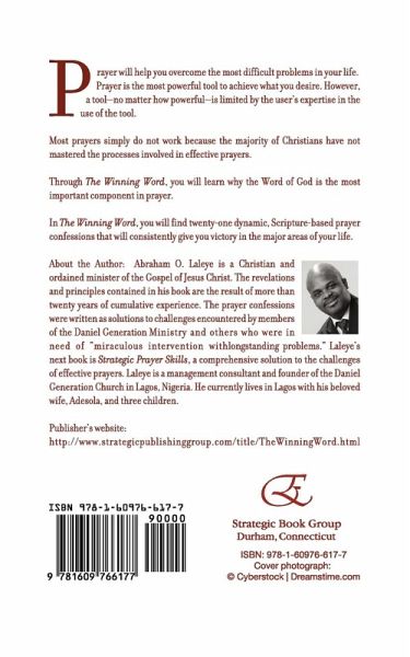 Prayer will help you overcome the most difficult problems in your life. Prayer is the most powerful tool to achieve what you desire. However, a tool-no matter how powerful-is limited by the user's expertise in the use of the tool. Most prayers simply do not work because the majority of Christians have not mastered the processes involved in effective prayers. Through The Winning Word, you will learn why the Word of God is the most important component in prayer. In The Winning Word, you will find twenty-one dynamic, Scripture-based prayer confessions that will consistently give you victory in the major areas of your life. About the Author: Abraham O. Laleye is a Christian and ordained minister of the Gospel of Jesus Christ. The revelations and principles contained in his book are the result of more than twenty years of cumulative experience. The prayer confessions were written as solutions to challenges encountered by members of the Daniel Generation Ministry and others who were in need of "miraculous intervention with longstanding problems." Laleye's next book is Strategic Prayer Skills, a comprehensive solution to the challenges of effective prayers. Laleye is a management consultant and founder of the Daniel Generation Church in Lagos, Nigeria. He currently lives in Lagos with his beloved wife, Adesola, and three children. Publisher's website: http://www.strategicpublishinggroup.com/title/TheWinningWord.html