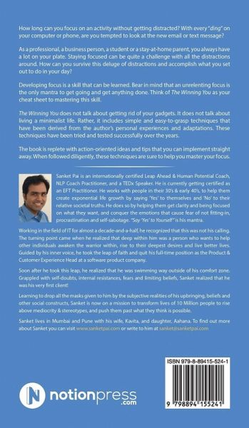 How long can you focus on an activity without getting distracted? With every "ding" on your computer or phone, are you tempted to look at the new email or text message? As a professional, a business person, a student or a stay-at-home parent, you always have a lot on your plate. Staying focused can be quite a challenge with all the distractions around. How can you survive this deluge of distractions and accomplish what you set out to do in your day? Developing focus is a skill that can be learned. Bear in mind that an unrelenting focus is the only mantra to get going and get anything done. Think of The Winning You as your cheat sheet to mastering this skill. The Winning You does not talk about getting rid of your gadgets. It does not talk about living a minimalist life. Rather, it includes simple and easy-to-grasp techniques that have been derived from the author's personal experiences and adaptations. These techniques have been tried and tested successfully over the years. The book is replete with action-oriented ideas and tips that you can implement straight away. When followed diligently, these techniques are sure to help you master your focus.