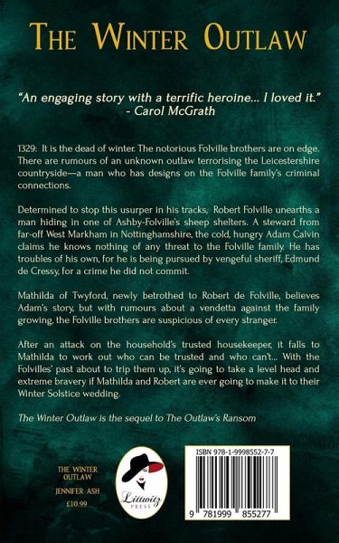 1329: It is the dead of winter. The notorious Folville brothers are on edge. There are rumours of an unknown outlaw terrorising the Leicestershire countryside—a man who has designs on the Folville family’s criminal connections. Determined to stop this usurper in his tracks, Robert Folville unearths a man hiding in one of Ashby-Folville’s sheep shelters. A steward from far-off West Markham in Nottinghamshire, the cold, hungry Adam Calvin claims he knows nothing of any threat to the Folville family. He has troubles of his own, for he is being pursued by vengeful sheriff, Edmund de Cressy, for a crime he did not commit. Mathilda of Twyford, newly betrothed to Robert de Folville, believes Adam’s story, but with rumours about a vendetta against the family growing, the Folville brothers are suspicious of every stranger. After an attack on the household’s trusted housekeeper, it falls to Mathilda to work out who can be trusted and who can’t... With the Folvilles’ past about to trip them up, it’s going to take a level head and extreme bravery if Mathilda and Robert are ever going to make it to their Winter Solstice wedding. The Winter Outlaw is the sequel to The Outlaw’s Ransom