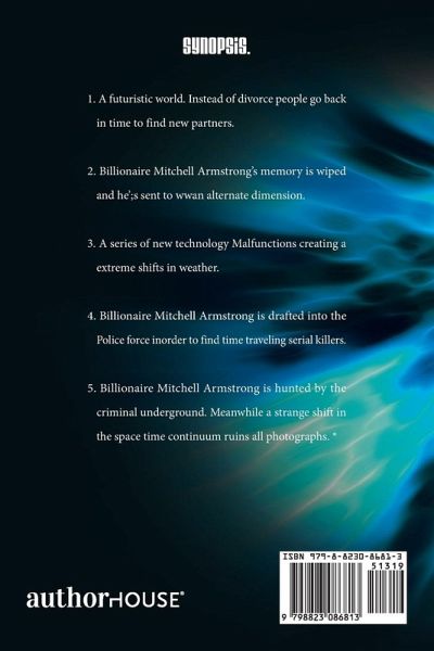 Synopsis. 1. A futuristic world. Instead of divorce people go back in time to find new partners. 2. Billionaire Mitchell Armstrong's memory is wiped and he';s sent to an alternate dimension. 3. A series of new technology Malfunctions creating a extreme shifts in weather. 4. Billionaire Mitchell Armstrong is drafted into the Police force inorder to find time traveling serial killers. 5. Billionaire Mitchell Armstrong is hunted by the criminal underground. Meanwhile a strange shift in the space time continuum ruins all photographs. *