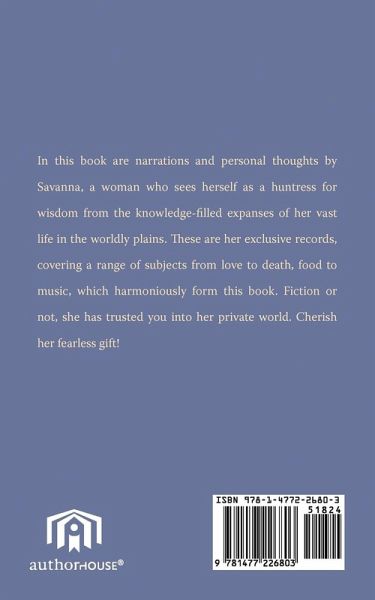 In this book are narrations and personal thoughts by Savanna, a woman who sees herself as a huntress for wisdom from the knowledge-filled expanses of her vast life in the worldly plains. These are her exclusive records, covering a range of subjects from love to death, food to music, which harmoniously form this book. Fiction or not, she has trusted you into her private world. Cherish her fearless gift!