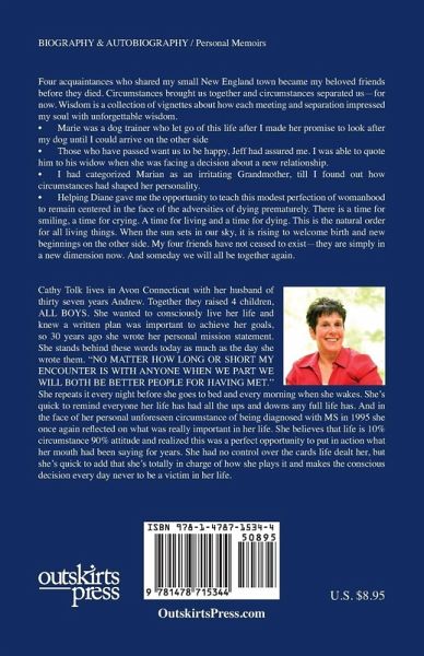 Four acquaintances who shared my small New England town became my beloved friends before they died. Circumstances brought us together and circumstances separated us-for now. Wisdom is a collection of vignettes about how each meeting and separation impressed my soul with unforgettable wisdom. Marie was a dog trainer who let go of this life after I made her promise to look after my dog until I could arrive on the other side. Those who have passed want us to be happy, Jeff had assured me. I was able to quote him to his widow when she was facing a decision about a new relationship. I had categorized Marian as an irritating Grandmother, till I found out how circumstances had shaped her personality. Helping Diane gave me the opportunity to teach this modest perfection of womanhood to remain centered in the face of the adversities of dying prematurely. There is a time for smiling, a time for crying. A time for living and a time for dying. This is the natural order for all living things. When the sun sets in our sky, it is rising to welcome birth and new beginnings on the other side. My four friends have not ceased to exist-they are simply in a new dimension now. And someday we will all be together again.