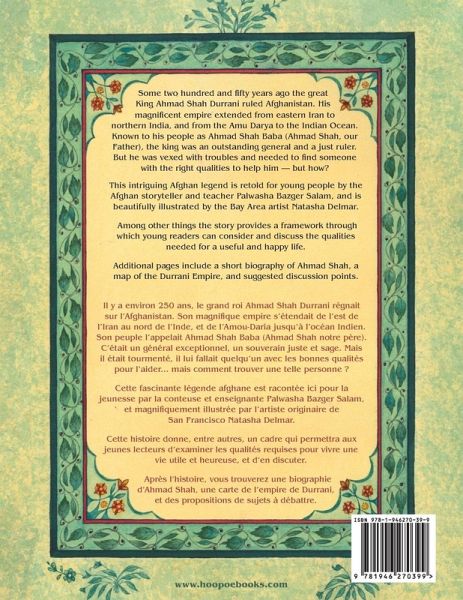 Some 250 years ago, the Great King Ahmad Shah Durrani ruled Afghanistan and, from there, a magnificent empire extending from eastern Iran to northern India, and from the Amu Darya River to the Indian Ocean. Known to his people as Ahmad Shah Baba (Ahmad Shah, our father), the beloved king was an outstanding general and a just and wise ruler. But he was vexed with all kinds of problems that threatened his kingdom, and he realized he needed to find someone with the right qualities to help him. The big question was how to find such a person. Among other things, this story provides a framework through which young readers can consider and discuss the qualities one needs in order to live a useful and happy life. This intriguing legend is retold for young people by the Afghan storyteller and teacher Palwasha Bazger Salam, and is beautifully illustrated by artist Natasha Delmar. Additional pages include a biography of Ahmad Shah, a map of the Durrani Empire and suggested discussion points.