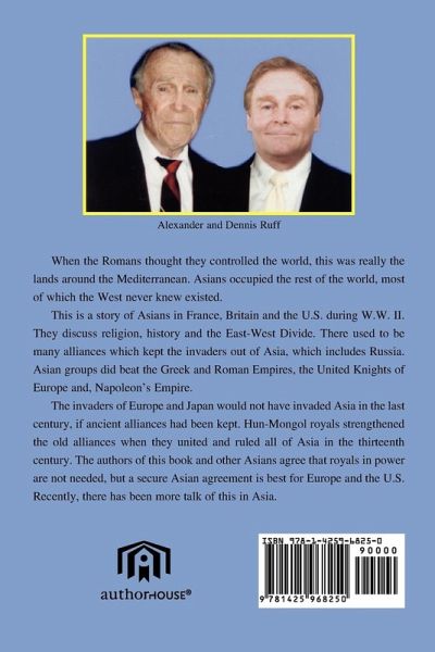 When the Romans thought they controlled the world, this was really the lands around the Mediterranean. The Asians occupied the rest of the world, most of which the West never knew existed. This is a story of Asian royals in France, Britain and the U.S. during W.W.II. They discuss religion, history and the East-West Divide. There were many alliances which were made to kepp the invaders of the West out of Asia. The Asian groups did beat the Greek and Roman Empires, as well as, the United Knights of Europe. All of the wars which occurred in the last century could have been avoided, if Asia, including Russia, had a mutual defense agreement. This was accomplished in the thirteenth century by Hun-Mongol royals. Also, there was a meeting of Asian leades in China around the middle of 2006.