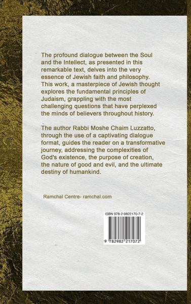 The profound dialogue between the Soul and the Intellect, as presented in this remarkable text, delves into the very essence of Jewish faith and philosophy. This work, a masterpiece of Jewish thought, explores the fundamental principles of Judaism, grappling with the most challenging questions that have perplexed the minds of believers throughout history. The author, Rabbi Moshe Chaim Luzzatto, through the use of a captivating dialogue format, guides the reader on a transformative journey, addressing the complexities of God's existence, the purpose of creation, the nature of good and evil, and the ultimate destiny of humankind. At its core, this text is a testament to the unwavering faith of the Jewish people and their relentless pursuit of truth and understanding. The Soul, representing the innate yearning for spiritual connection and enlightenment, seeks guidance from the Intellect, the embodiment of wisdom and rational inquiry. Together, they embark on a quest to unravel the mysteries of the universe and the human condition, drawing upon the rich tapestry of Jewish scriptures, rabbinic literature, and philosophical thought. The dialogue begins with an exploration of the Thirteen Principles of Faith, as articulated by the renowned Jewish philosopher Maimonides. These principles serve as the bedrock of Jewish belief, encompassing the essential tenets of God's existence, unity, incorporeality, and eternity. The Soul and the Intellect meticulously examine each principle, providing compelling arguments and insights that strengthen the reader's understanding and conviction in these fundamental truths. As the dialogue progresses, the text delves into the perplexing issue of theodicy - the presence of evil and suffering in a world created by a benevolent and omnipotent God. The Soul grapples with the age-old question of why the righteous suffer while the wicked prosper, seeking to reconcile this apparent injustice with the concept of divine providence. The Intellect, through a series of profound explanations and analogies, reveals the hidden wisdom behind God's ways, emphasizing the ultimate justice that will be served and the role of evil as a preparation for a greater good. The purpose of creation and the role of humankind within the grand cosmic scheme is another central theme explored in this text. The Soul yearns to understand the reason for its existence and the ultimate goal of its earthly journey. The Intellect, drawing upon the rich tradition of Jewish thought, presents a compelling vision of God's desire to benefit His creatures and the unique opportunity granted to human beings to perfect themselves through their own efforts. The text emphasizes the importance of repairing deficiencies, both within oneself and in the world at large, as a means of attaining closeness to God and fulfilling one's divine purpose.
