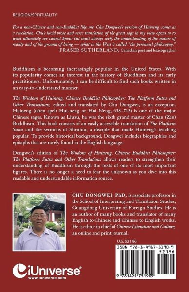 For a non-Chinese and non-Buddhist like me, Chu Dongwei's version of Huineng comes as a revelation. Chu's lucid prose and verse translation of the great sage in my view opens us to what ultimately we cannot know but must always seek: the understanding of the nature of reality and of the ground of being - what in the West is called "the perennial philosophy." Fraser Sutherland, Canadian poet and lexicographer Buddhism is becoming increasingly popular in the United States. With its popularity comes an interest in the history of Buddhism and its early practitioners. Unfortunately, it can be difficult to find such books written in an easy-to-understand manner. The Wisdom of Huineng, Chinese Buddhist Philosopher: The Platform Sutra and Other Translations, edited and translated by Chu Dongwei, is an exception. Huineng (often spelt Hui-neng or Hui Neng, 638-713) is one of the major Chinese sages. Known as Liuzu, he was the sixth grand master of Chan (Zen) Buddhism. This book consists of an easily accessible translation of The Platform Sutra and the sermons of Shenhui, a disciple that made Huineng's teaching popular. To provide historical background, Dongwei includes biographies and epitaphs that are rarely found in the English language. Dongwei's edition of The Wisdom of Huineng, Chinese Buddhist Philosopher: The Platform Sutra and Other Translations allows readers to strengthen their understanding of Buddhism through the texts of one of its most important figures. There is no longer a need to fear the unknown as you dive into this readable and understandable information source.