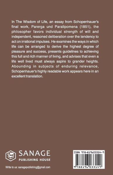 In The Wisdom of Life, an essay from Schopenhauer's final work, Parerga und Paralipomena (1851), the philosopher favors individual strength of will and independent, reasoned deliberation over the tendency to act on irrational impulses. He examines the ways in which life can be arranged to derive the highest degree of pleasure and success, presents guidelines to achieving this full and rich manner of living, and advises that even a life well lived must always aspire to grander heights. Abounding in subjects of enduring relevance, Schopenhauer's highly readable work appears here in an excellent translation.