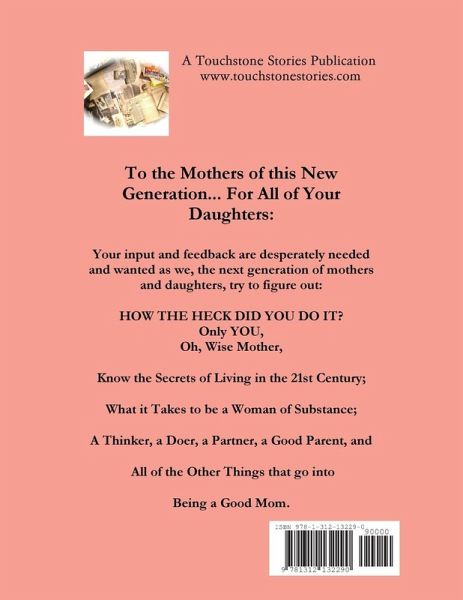 A memory gift book for mother's in a template, fill-in-the blanks book of questions for mother about life. A dedication at the front of the book asks mom to answer the questions with fun image prompts and then return it to the giver of the book. It is a daughters celebration of her mother's wisdom and a plea for a mother's advice, memories and ideas on a variety of topics. A loving tribute to mother and a wonderful legacy book for the family.