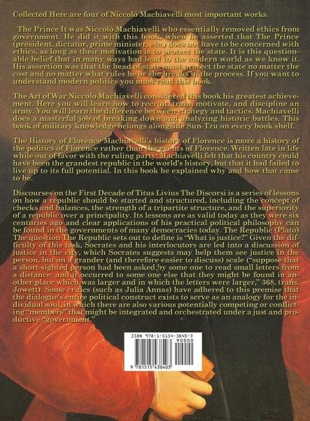 Collected Here are four of Niccolò Machiavelli most important works. The Prince It was Niccolò Machiavelli who essentially removed ethics from government. He did it with this book, when he asserted that The Prince (president, dictator, prime minister, etc.) does not have to be concerned with ethics, as long as their motivation is to protect the state. It is this questionable belief that in many ways had lead to the modern world as we know it.