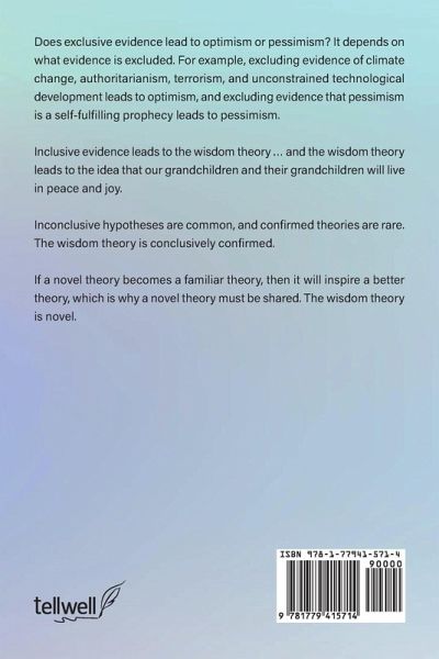 Does exclusive evidence lead to optimism or pessimism? It depends on what evidence is excluded. For example, excluding evidence of climate change, authoritarianism, terrorism, and unconstrained technological development leads to optimism, and excluding evidence that pessimism is a self-fulfilling prophecy leads to pessimism. Inclusive evidence leads to the wisdom theory ... and the wisdom theory leads to the idea that our grandchildren and their grandchildren will live in peace and joy. Inconclusive hypotheses are common, and confirmed theories are rare. The wisdom theory is conclusively confirmed. If a novel theory becomes a familiar theory, then it will inspire a better theory, which is why a novel theory must be shared. The wisdom theory is novel.