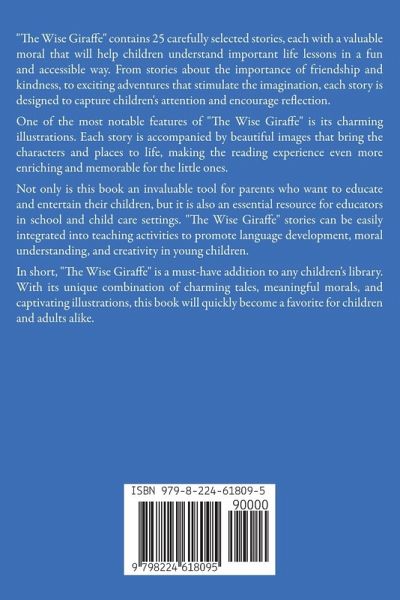 Dear educators and parents, This book is much more than a collection of children's stories. It is an invaluable tool for the education and entertainment of the little ones, designed specifically for children up to 5 years of age. "The Wise Giraffe" contains 25 carefully selected stories, each with a valuable moral that will help children understand important life lessons in a fun and accessible way. From stories about the importance of friendship and kindness, to exciting adventures that stimulate the imagination, each story is designed to capture children's attention and encourage reflection. One of the most notable features of "The Wise Giraffe" is its charming illustrations. Each story is accompanied by beautiful images that bring the characters and places to life, making the reading experience even more enriching and memorable for the little ones. Not only is this book an invaluable tool for parents who want to educate and entertain their children, but it is also an essential resource for educators in school and child care settings. "The Wise Giraffe" stories can be easily integrated into teaching activities to promote language development, moral understanding, and creativity in young children. In short, "The Wise Giraffe" is a must-have addition to any children's library. With its unique combination of charming tales, meaningful morals, and captivating illustrations, this book will quickly become a favorite for children and adults alike. Don't miss the opportunity to embark on this wonderful adventure of learning and fun with "The Wise Giraffe"!