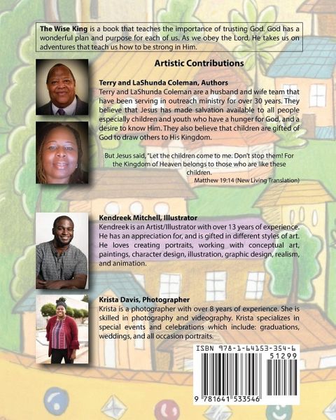 The Wise King is a book that teaches the importance of trusting God. The reader is taken on an adventure where God's love is revealed through our obedience to Him and His word. This book is excellent for instructing children and youths in a Biblical worldview. It is perfect for Christian youth groups, Children's Ministries, families and Christian outreach organizations.