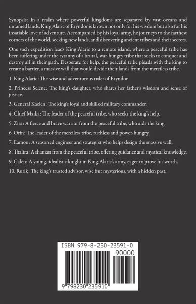 Synopsis: In a realm where powerful kingdoms are separated by vast oceans and untamed lands, King Alaric of Eryndor is known not only for his wisdom but also for his insatiable love of adventure. Accompanied by his loyal army, he journeys to the farthest corners of the world, seeking new lands, and discovering ancient tribes and their secrets. One such expedition leads King Alaric to a remote island, where a peaceful tribe has been suffering under the tyranny of a brutal, war-hungry tribe that seeks to conquer and destroy all in their path. Desperate for help, the peaceful tribe pleads with the king to create a barrier, a massive wall that would divide their lands from the merciless tribe. 1. King Alaric: The wise and adventurous ruler of Eryndor. 2. Princess Selene: The king's daughter, who shares her father's wisdom and sense of justice. 3. General Kaelen: The king's loyal and skilled military commander. 4. Chief Maika: The leader of the peaceful tribe, who seeks the king's help. 5. Zira: A fierce and brave warrior from the peaceful tribe, who aids the king. 6. Orin: The leader of the merciless tribe, ruthless and power-hungry. 7. Eamon: A seasoned engineer and strategist who helps design the massive wall. 8. Thalira: A shaman from the peaceful tribe, offering guidance and mystical knowledge. 9. Galen: A young, idealistic knight in King Alaric's army, eager to prove his worth. 10. Rurik: The king's trusted advisor, wise but mysterious, with a hidden past.