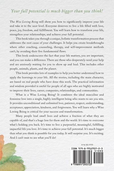 The Wise Loving Being will show you how to significantly improve your life and take it to the next level. Everyone deserves to live a life filled with love, peace, joy, freedom, and fulfillment. You will learn how to transform your life, strengthen your relationships, and achieve your full potential. This book takes you through a unique, holistic transformation process that addresses the root cause of your challenges. It helps you create breakthroughs where other books, coaching, counseling, seminars, therapy, training, and self-improvement methods can't, by avoiding their five fundamental flaws. This book underscores the fact that your life matters, you are important, and you can make a difference. There are those who desperately need your help and are anxiously waiting for you to show up and lead. This includes other people, animals, plants, and the planet. This book provides lots of examples to help you better understand how to apply the learnings to your life. All the stories, including the main character, are based on real people who have done this work. The practical information and wisdom provided is useful for people of all ages who are highly motivated to improve their lives, career, companies, relationships, and communities. What is a Wise Loving Being? It combines the ideal masculine and feminine love into a single, highly intelligent being who wants to see you win. It provides unconditional and unlimited love, patience, respect, understanding, acceptance, appreciation, kindness, and forgiveness. You will learn why a Wise Loving Being is critical for your success and transformation. Many people lead small lives and achieve a fraction of what they are capable of, and that's a huge loss for them and the world. It's time to overcome what's holding you back. It's time to live a purposeful, meaningful, fulfilling, impactful life you love. It's time to achieve your full potential. It's much bigger than what you think is possible for you today. It will surprise you. It's exciting. And I can't wait to see what you'll do!