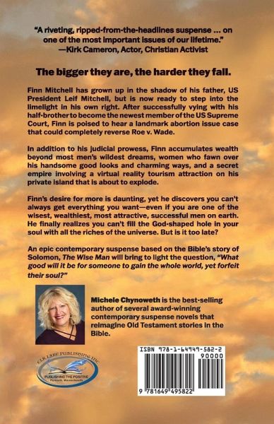 "A riveting, ripped-from-the-headlines suspense ... on one of the most important issues of our lifetime." The bigger they are, the harder they fall. Finn Mitchell has grown up in the shadow of his father, US President Leif Mitchell, but is now ready to step into the limelight in his own right. After successfully vying with his half-brother to become the newest member of the U.S. Supreme Court, Finn is poised to hear a landmark abortion issue case that could completely reverse Roe v. Wade. In addition to his judicial prowess, Finn accumulates wealth beyond most men's wildest dreams, women who fawn over his handsome good looks and charming ways, and a secret empire involving a virtual reality tourism attraction on his private island that is about to explode. Finn's desire for more is daunting, yet he discovers you can't always get everything you want-even if you are one of the wisest, wealthiest, most attractive, successful men on earth. He finally realizes you can't fill the God-shaped hole in your soul with all the riches of the universe. But is it too late? An epic contemporary suspense based on the Bible's story of Solomon, The Wise Man will bring to light the question, "What good will it be for someone to gain the whole world, yet forfeit their soul?"