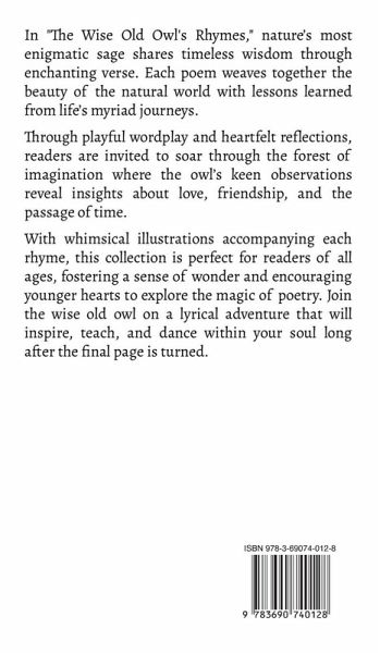 In "The Wise Old Owl's Rhymes," nature's most enigmatic sage shares timeless wisdom through enchanting verse. Each poem weaves together the beauty of the natural world with lessons learned from life's myriad journeys. Through playful wordplay and heartfelt reflections, readers are invited to soar through the forest of imagination where the owl's keen observations reveal insights about love, friendship, and the passage of time. With whimsical illustrations accompanying each rhyme, this collection is perfect for readers of all ages, fostering a sense of wonder and encouraging younger hearts to explore the magic of poetry. Join the wise old owl on a lyrical adventure that will inspire, teach, and dance within your soul long after the final page is turned.