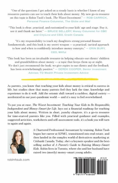 *Winner of the EIFLE Award for Best Adult Book of 2022 by the Institute for Financial Literacy.* "A treasure chest of great ideas presented in short, punchy chapters. Excellent!" - David Chilton, author of The Wealthy Barber¿ "One of the questions I get asked on a steady basis is whether I know of any resources parents can use to teach their kids about money. My new go-to resource on this topic is Robin Taub's book, The Wisest Investment." - Rob Carrick, Personal Finance Columnist, The Globe and Mail If you're too busy parenting to read another parenting book, this book is for you! As parents, you know that teaching your kids about money is critical to success in life, but studies show that many parents feel they lack the time, knowledge and experience to do it well. Add the seismic shift toward a cashless, digital society - accelerated in our post-pandemic world - and it's easy to feel overwhelmed. With The Wisest Investment: Teaching Your Kids to Be Responsible, Independent and Money-Smart for Life, award-winning Canadian author and Chartered Professional Account Robin Taub puts you at ease by laying out a roadmap for teaching your kids about money. In The Wisest Investment, you'll learn: The Five Pillars of money: Earn, Save, Spend, Share and Invest Age-appropriate (from young kids to emerging adults) examples, actions and guidelines for all Five Pillars How to instill solid values in your children to help guide and prioritize their financial decisions How to help your children establish healthy money habits for life How to capitalize on "teachable moments" about money in countless everyday scenarios How to enhance your own money knowledge, so you can "lead by example" How to explain and navigate our increasingly cashless society Written in short, punchy chapters, it's a go-to resource for time-starved parents like you. Filled with practical guidance and examples, suggested activities, worksheets and self-assessment tools, it's a book you will turn to again and again. Teaching your kids to be money-smart will pay off in numerous ways and just may be one of the wisest investments you make.