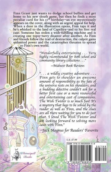 Finn Grant just wants to dodge school bullies and get home to his new sleuth game, Haunted Holmes, but then he finds a most peculiar card for his 11th birthday--an eye mysteriously appears on the cover, along with an urgent appeal for help. When a door in the illustration opens, Finn taps it and he's whisked to the magical land of Capriliya--and to his first real case. Someone has stolen a wish-fulfilling machine and wished people gone, and Finn must find the disappeared and solve the mystery before the thief creates even worse disasters. As Finn and his friends follow the trail of clues, the culprit swiftly gains unlimited power, vaporizing or warping cities. The case seems hopeless. Finn is stumped--how can he discover the identity of the demolisher, outsmart him and stop him before the catastrophes spread to Finn's own world?