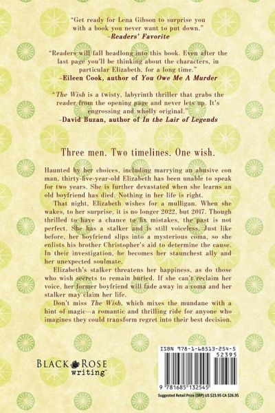 Maxy Award Winner - Romance & Women's Fiction Three men. Two timelines. One wish. Haunted by her choices, including marrying an abusive con man, thirty-five-year-old Elizabeth has been unable to speak for two years. She is further devastated when she learns an old boyfriend has died. Nothing in her life is right. That night, Elizabeth wishes for a mulligan. When she wakes, to her surprise, it is no longer 2022, but 2017. Though thrilled to have a chance to fix mistakes, the past is not perfect. She has a stalker and is still voiceless. Just like before, her boyfriend slips into a mysterious coma, so she enlists his brother Christopher's aid to determine the cause. In their investigation, he becomes her staunchest ally and her unexpected soulmate. Elizabeth's stalker threatens her happiness, as do those who wish secrets to remain buried. If she can't reclaim her voice, her former boyfriend will fade away in a coma and her stalker may claim her life. Don't miss The Wish, which mixes the mundane with a hint of magic-a romantic and thrilling ride for anyone who imagines they could transform regret into their best decision.