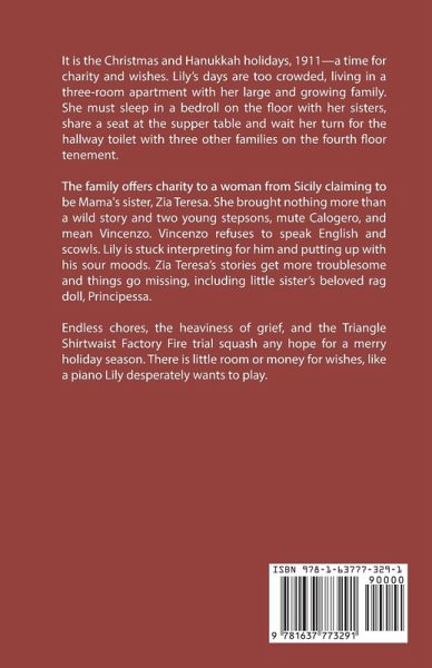 It is the Christmas and Hanukkah holidays, 1911-a time for charity and wishes. Lily's days are too crowded, living in a three-room apartment with her large and growing family. She must sleep in a bedroll on the floor with her sisters, share a seat at the supper table and wait her turn for the hallway toilet with three other families on the fourth floor tenement. The family offers charity to a woman from Sicily claiming to be Mama's sister, Zia Teresa. She brought nothing more than a wild story and two young stepsons, mute Calogero, and mean Vincenzo. Vincenzo refuses to speak English and scowls. Lily is stuck interpreting for him and putting up with his sour moods. Zia Teresa's stories get more troublesome and things go missing, including little sister's beloved rag doll, Principessa. Endless chores, the heaviness of grief, and the Triangle Shirtwaist Factory Fire trial squash any hope for a merry holiday season. There is little room or money for wishes, like a piano Lily desperately wants to play.