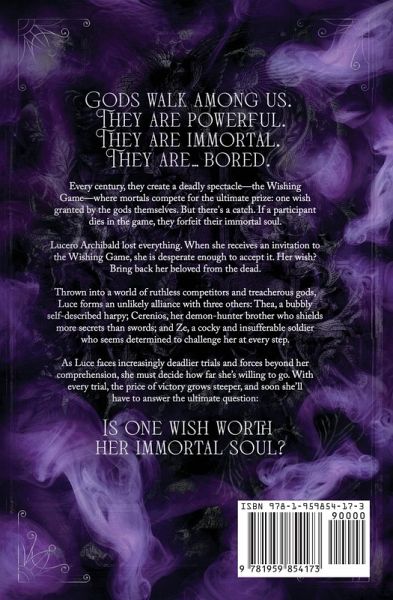 Gods walk among us. They are powerful. They are immortal. They are...bored. Every century, they create a deadly spectacle-the Wishing Game-where mortals compete for the ultimate one wish granted by the gods themselves. But there's a catch. If a participant dies in the game, they forfeit their immortal soul. Lucero Archibald lost everything. When she receives an invitation to the Wishing Game, she is desperate enough to accept it. Her wish? Bring back her beloved from the dead. Thrown into a world of ruthless competitors and treacherous gods, Luce forms an unlikely alliance with three Thea, a bubbly self-described harpy; Cerenios, her demon-hunter brother who shields more secrets than swords; and Ze, a cocky and insufferable soldier who seems determined to challenge her at every step. As Luce faces increasingly deadlier trials and forces beyond her comprehension, she must decide how far she's willing to go. With every trial, the price of victory grows steeper, and soon she'll have to answer the ultimate Is one wish worth her immortal soul? Squid Games meets Ancient Gods in this new epic fantasy romance about a hopeless woman willing to risk her immortal soul for the chance to have her most ardent wish come true and an emotionless ancient god who will do everything in his power to stop her.