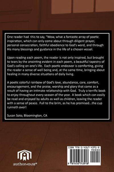 One reader had this to say, "Wow, what a fantastic array of poetic inspiration, which can only come about through diligent prayer, personal consecration, faithful obedience to God's word, and through His many blessings and guidance in the life of a chosen vessel. Upon reading each poem, the reader is not only inspired, but brought to tears by the anointing evident in each poem, a beautiful tapestry of God's calling on one's life. Each poetic endeavor is comforting, giving the reader a sense of well being and, at the same time, bringing about healing in many diverse situations of daily living. A poetic colorful rainbow of God's love, abundance, care, comfort, encouragement, and the praise, worship and glory that come as a result of having an intimate relationship with God. Truly a terrific book to enjoy throughout every season of the year. A book which can easily be read and enjoyed by adults as well as children, leaving the reader with a sense of peace. Full to the brim, as he has promised...the cup runneth over! Susan Soto, Bloomington, CA