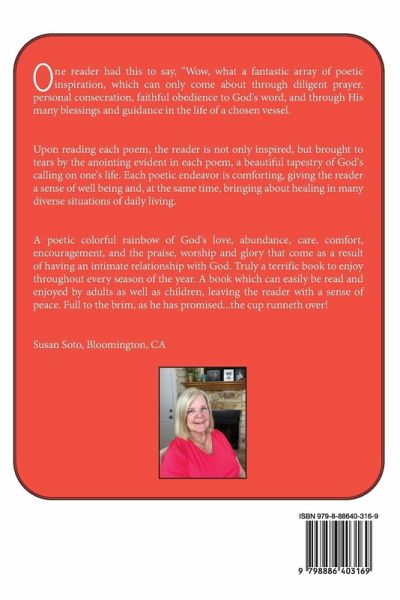 One reader had this to say, "Wow, what a fantastic array of poetic inspiration, which can only come about through diligent prayer, personal consecration, faithful obedience to God's word, and through His many blessings and guidance in the life of a chosen vessel. Upon reading each poem, the reader is not only inspired, but brought to tears by the anointing evident in each poem, a beautiful tapestry of God's calling on one's life. Each poetic endeavor is comforting, giving the reader a sense of well being and, at the same time, bringing about healing in many diverse situations of daily living. A poetic colorful rainbow of God's love, abundance, care, comfort, encouragement, and the praise, worship and glory that come as a result of having an intimate relationship with God. Truly a terrific book to enjoy throughout every season of the year. A book which can easily be read and enjoyed by adults as well as children, leaving the reader with a sense of peace. Full to the brim, as he has promised...the cup runneth over!