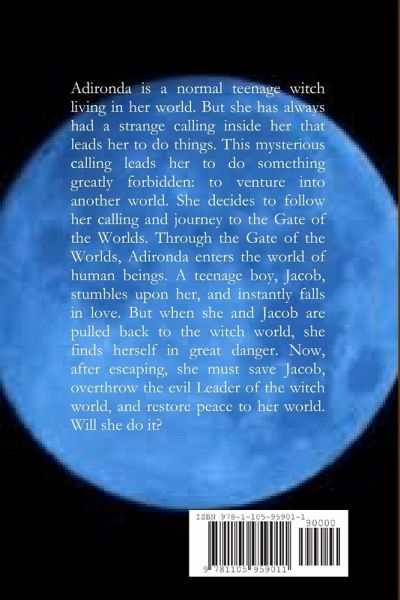 Adironda is a normal teenage witch living in her world. But she has always had a strange calling inside her that leads her to do things. This mysterious calling leads her to do something greatly forbidden: to venture into another world. She decides to follow her calling and journey to the Gate of the Worlds. Through the Gate of the Worlds, Adironda enters the world of human beings. A teenage boy, Jacob, stumbles upon her, and instantly falls in love. But when she and Jacob are pulled back to the witch world, she finds herself in great danger. Now, after escaping, she must save Jacob, overthrow the evil Leader of the witch world, and restore peace to her world. Will she do it?