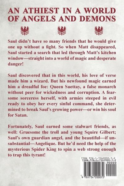 AN ATHEIST IN A WORLD OF ANGELS AND DEMONS Saul didn't have so many friends that he would give one up without a fight. So when Matt disappeared, Saul started a search that led through Matt's kitchen window -- straight into a world of magic and desperate danger! Saul discovered that in this world, his love of verse made him a wizard. But his newfound magic earned him a dreadful foe: Queen Suettay, a false monarch without peer for wickedness and corruption. A fearsome sorceress herself, with armies steeped in evil ready to obey her every sinful command, she determined to break Saul's growing power -- or win his soul for Satan. Fortunately, Saul earned some stalwart friends, as well: Gruesome the troll and young Squire Gilbert; Saul's own guardian angel, and the beautiful -- if unsubstantial -- Angelique. But he'd need the help of the mysterious Spider King to spin a web strong enough to trap this tyrant!