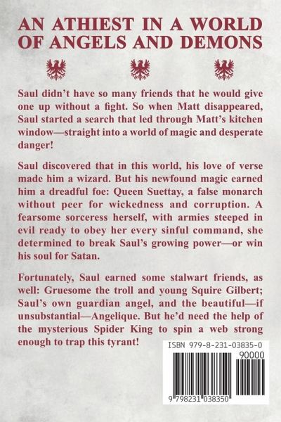 AN ATHEIST IN A WORLD OF ANGELS AND DEMONS Saul didn't have so many friends that he would give one up without a fight. So when Matt disappeared, Saul started a search that led through Matt's kitchen window -- straight into a world of magic and desperate danger! Saul discovered that in this world, his love of verse made him a wizard. But his newfound magic earned him a dreadful foe: Queen Suettay, a false monarch without peer for wickedness and corruption. A fearsome sorceress herself, with armies steeped in evil ready to obey her every sinful command, she determined to break Saul's growing power -- or win his soul for Satan. Fortunately, Saul earned some stalwart friends, as well: Gruesome the troll and young Squire Gilbert; Saul's own guardian angel, and the beautiful -- if unsubstantial -- Angelique. But he'd need the help of the mysterious Spider King to spin a web strong enough to trap this tyrant!