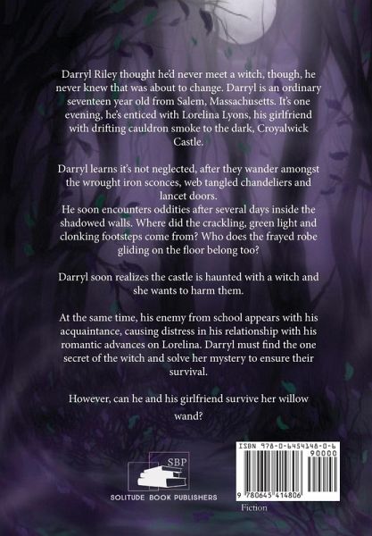 The Witch Haunting What would you do if a spooky, magical witch was following you and you had nowhere to hide? Darryl Riley thought he'd never meet a witch, though, he never knew that was about to change. Darryl is an ordinary seventeen year old from Salem, Massachusetts. It's one evening, he's enticed with Lorelina Lyons, his girlfriend with drifting cauldron smoke to the dark, Croyalwick Castle. Darryl learns it's not neglected, after they wander amongst the wrought iron sconces, web tangled chandeliers and lancet doors. He soon encounters oddities after several days inside the shadowed walls. Where did the crackling, green light and clonking footsteps come from? Who does the frayed robe gliding on the floor belong too? Darryl soon realizes the castle is haunted with a witch and she wants to harm them. At the same time, his enemy from school appears with his acquaintance, causing distress in his relationship with his romantic advances on Lorelina. Darryl must find the one secret of the witch and solve her mystery to ensure their survival. However, can he and his girlfriend survive her willow wand? The Witch Haunting is for fans of young adult horror books and magical realism novels.