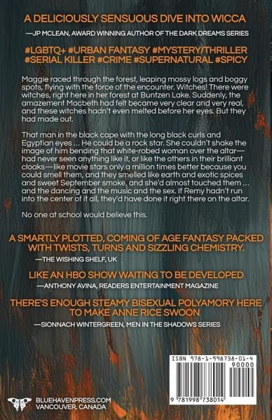 "A SMARTY PLOTTED, COMING OF AGE FANTASY PACKED WITH TWIST, TURNS - AND SIZZLING CHEMISTRY." -THE WISHING SHELF, UK"A DELICIOUSLY SENSUOUS DIVE INTO WICCA "-JP MCLEAN, award-winning author of the Dark Dreams Series "A MAGICALLY EDGY COMING-OF-AGE STORY" -DIDI OVIATT, author of Aggravated Momentum Maggie raced through the forest, leaping mossy logs and boggy spots, flying with the force of the encounter. Witches! There were witches, right here in her forest at Buntzen Lake. Suddenly, the amazement Macbeth had felt became very clear and very real, and these witches hadn't even melted before her eyes. But they had made out. That man in the black cape with the long black curls and Egyptian eyes ... He could be a rock star. She couldn't shake the image of him bending that white-robed woman over the altar-had never seen anything like it, or like the others in their brilliant cloaks-like movie stars only a million times better because you could smell them, and they smelled like earth and exotic spices and sweet September smoke, and she'd almost touched them ... and the dancing and the music and the sex. If Remy hadn't run into the center of it all, they'd have done it right there on the altar. No one at school would believe this. #LGBTQ+ #urban fantasy #mystery/thriller #serial killer #crime #supernatural #spicy #hot