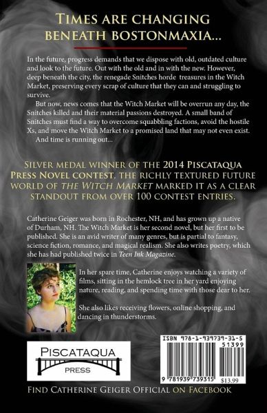 In the future, progress demands that we dispose with old, outdated culture and look to the future. Out with the old and in with the new. However, deep beneath the city, the renegade Snitches horde treasures in the Witch Market, preserving every scrap of culture that they can and struggling to survive. But now, news comes that the Witch Market will be overrun any day, the Snitches killed and their material passions destroyed. A small band of Snitches must find a way to overcome squabbling factions, avoid the hostile Xs, and move the Witch Market to a promised land that may not even exist. And time is running out... Silver medal winner of the 2014 Piscataqua Press Novel contest, the richly textured future world of the Witch Market marked it as a clear standout from over 100 contest entries. Catherine Geiger was born in Rochester, NH, and has grown up a native of Durham, NH. The Witch Market is her second novel, but her first to be published. She is an avid writer of many genres, but is partial to fantasy, science fiction, romance, and magical realism. She also writes poetry, which she has had published twice in Teen Ink Magazine. In her spare time, Catherine enjoys watching a variety of films, sitting in the hemlock tree in her yard enjoying nature, reading, and spending time with those dear to her. She also likes receiving flowers, online shopping, and dancing in thunderstorms.