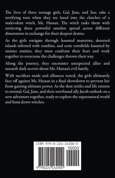The lives of three teenage girls, Gal, Jane, and Sue, take a terrifying turn when they are lured into the clutches of a malevolent witch, Ms. Hassan. The witch tasks them with retrieving three powerful amulets spread across different dimensions in exchange for their deepest desires. As the girls navigate through haunted mansions, deserted islands infested with zombies, and eerie cornfields haunted by sinister entities, they must confront their fears and work together to overcome the challenges thrown their way. Along the journey, they encounter unexpected allies and unearth dark secrets about Ms. Hassan's evil family. With sacrifices made and alliances tested, the girls ultimately face off against Ms. Hassan in a final showdown to prevent her from gaining ultimate power. As the dust settles and life returns to normal, Gal, Jane, and their newfound ally Jacob embark on a new adventure together, ready to explore the supernatural world and hunt down witches.