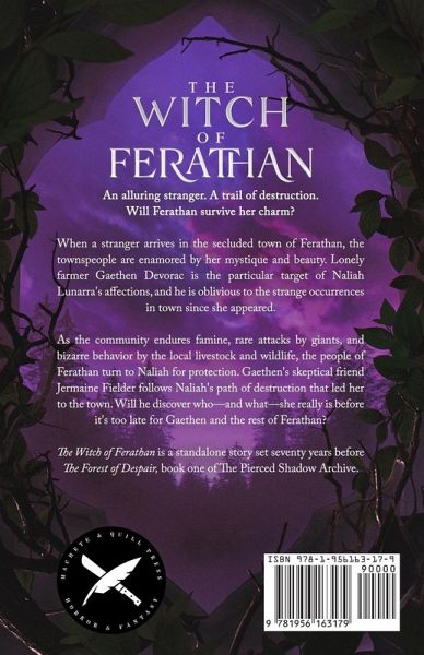 An alluring stranger. A trail of destruction. Will Ferathan survive her charm? When a stranger arrives in the secluded town of Ferathan, the townspeople are enamored by her mystique and beauty. Lonely farmer Gaethen Devorac is the particular target of Naliah Lunarra's affections, and he is oblivious to the strange occurrences in town since she appeared. As the community endures famine, rare attacks by giants, and bizarre behavior by the local livestock and wildlife, the people of Ferathan turn to Naliah for protection. Gaethen's skeptical friend Jermaine Fielder follows Naliah's path of destruction that led her to the town. Will he discover who-and what-she really is before it's too late for Gaethen and the rest of Ferathan? The Witch of Ferathan is a standalone story set seventy years before The Forest of Despair, book one of The Pierced Shadow Archive. Chapter one of The Forest of Despair is also included as a special sneak preview.