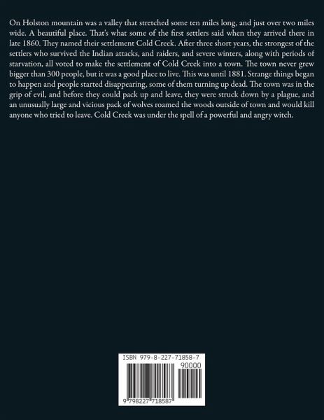 On Holston mountain was a valley that stretched some ten miles long, and just over two miles wide. A beautiful place. That's what some of the first settlers said when they arrived there in late 1860. They named their settlement Cold Creek. After three short years, the strongest of the settlers who survived the Indian attacks, and raiders, and severe winters, along with periods of starvation, all voted to make the settlement of Cold Creek into a town. The town never grew bigger than 300 people, but it was a good place to live. This was until 1881. Strange things began to happen and people started disappearing, some of them turning up dead. The town was in the grip of evil, and before they could pack up and leave, they were struck down by a plague, and an unusually large and vicious pack of wolves roamed the woods outside of town and would kill anyone who tried to leave. Cold Creek was under the spell of a powerful and angry witch.