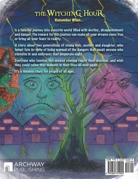 THE WITCHING HOUR - Remember When... is a fanciful journey into a mystic world filled with destiny, disappointment and danger. The reward for this journey can make all your dreams come true or bring all your fears to reality. A story about two generations of young kids, mother and daughter, who tempt fate in-spite of being warned of the dangers that await anyone who ventures in and embraces that desperate night. Everyone who touches this wicked evening regret their decision, and wish they could relive that moment in their lives all over again. It's a timeless story for people of all ages.
