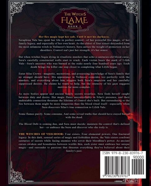 THE WITCH'S FLAME Book One of THE WITCHES OF VEILMOOR Her fire magic kept her safe. Until it met his darkness. Seraphina Vale has spent her life in perfect control-of her powerful fire magic, of her family legacy, and especially of her own heart. As the eldest of four sisters descended from the most infamous witch in Veilmoor's history, Sera carries the weight of protection on her shoulders. Control isn't just her strength; it's her armor. But when witches begin dying in ritualistic murders that echo a centuries-old blood curse, Sera's carefully constructed walls start to crack. Each victim bears the mark of Lilith Vale-Sera's ancestor who was burned at the stake nearly four hundred years ago. Each death brings the killer one step closer to completing what Lilith began. Enter Silas Crowe-magnetic, mysterious, and possessing knowledge of Sera's family that no stranger should have. His appearance in Veilmoor coincides too perfectly with the murders, and everything about him triggers both Sera's suspicion and her carefully suppressed desires. He claims he wants to help, but the intensity of his gaze suggests motives far more complex. As more bodies appear and ancient family secrets resurface, Sera finds herself caught between duty and desire. Her magic flares uncontrollably in Silas's presence, and their undeniable connection threatens the lifetime of control she's built. But surrendering to the fire between them might be more dangerous than the blood ritual itself-especially when Sera discovers Silas's true connection to Lilith Vale. Some flames purify. Some consume. And some reveal truths that should have stayed buried with the dead. The Blood Debt is coming due, and Sera must decide: maintain the control that's defined her-or embrace the burn and discover who she truly is. THE WITCHES OF VEILMOOR: Four sisters. Four elemental powers. One fractured legacy. In this dark, sensual series of magic and forbidden desire, the Vale sisters confront centuries of secrets while facing enemies who covet their bloodline's power. As ancient curses awaken and boundaries between worlds thin, each sister must embrace her unique magic-and surrender to passions that threaten everything they've believed about their family's past.